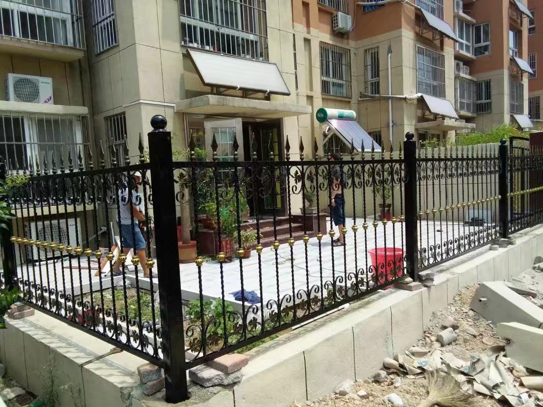 圍欄由黑色金屬制成,設(shè)計精美,帶有金色的裝飾點綴,顯得非常典雅。圍欄的柱子頂部是圓形的,增加了整體的美觀度。
