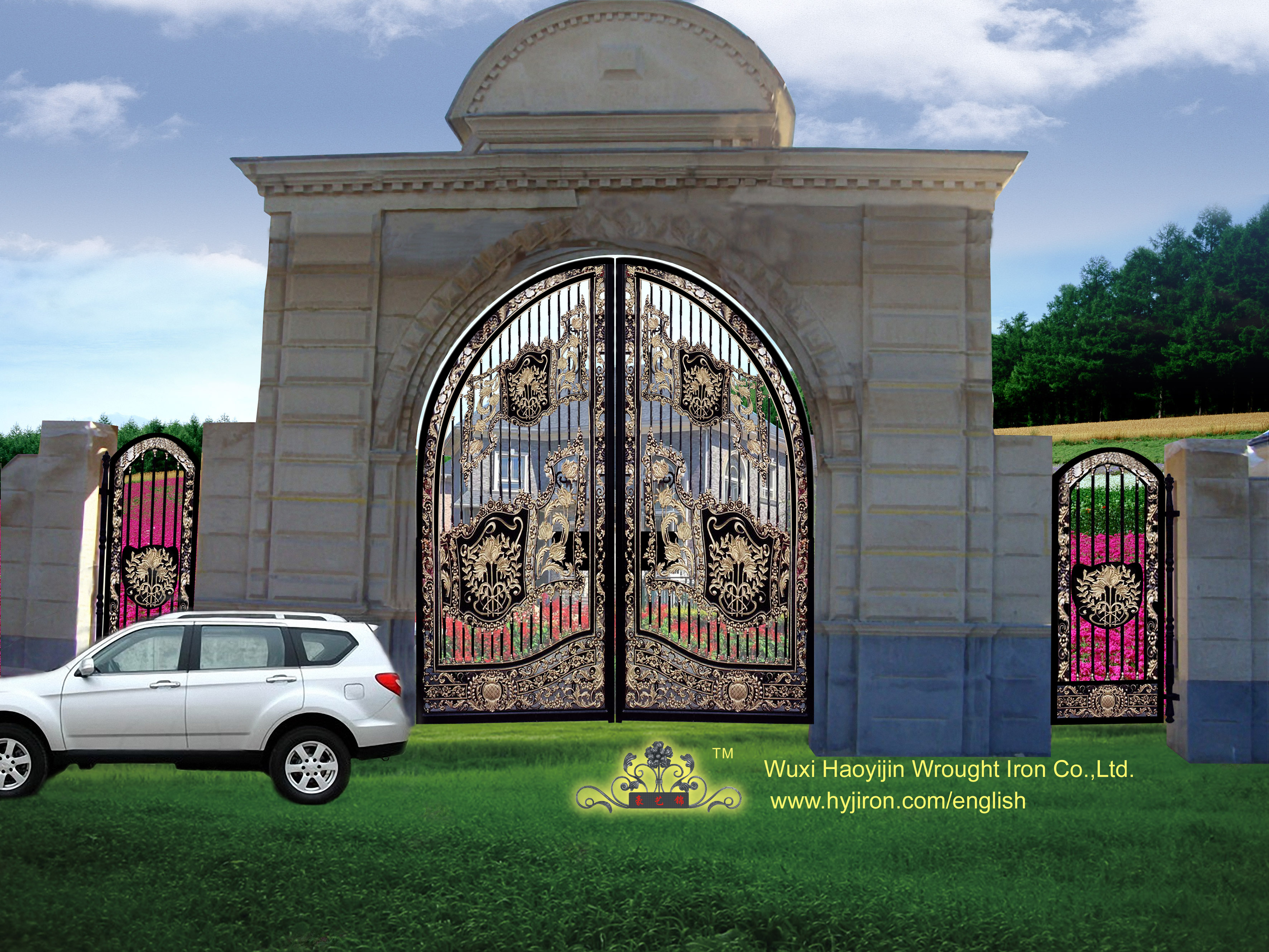 該款編號為TYM-002型號大門,是無錫鐵藝護欄門窗廠為豪華別墅庭院專門設計的一款優雅古典的鐵藝大門。該款鐵藝大門設計新穎獨特,做工精細,外觀尊貴大氣。在盡顯你身份地位的同時,展現你的藝術氣質。